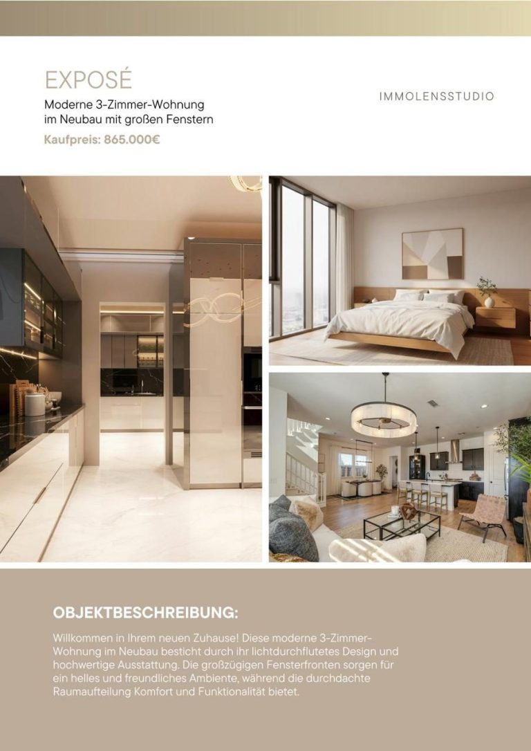 Mit jahrelanger Erfahrung in der Immobilienbranche wissen wir bei ImmoLensStudio, wie wichtig eine überzeugende Präsentation für den erfolgreichen Verkauf oder die Vermietung einer Immobilie ist. Ein professionelles Exposé ist dabei das A und O, um Ihre Immobilie potenziellen Käufern oder Mietern im besten Licht zu zeigen.